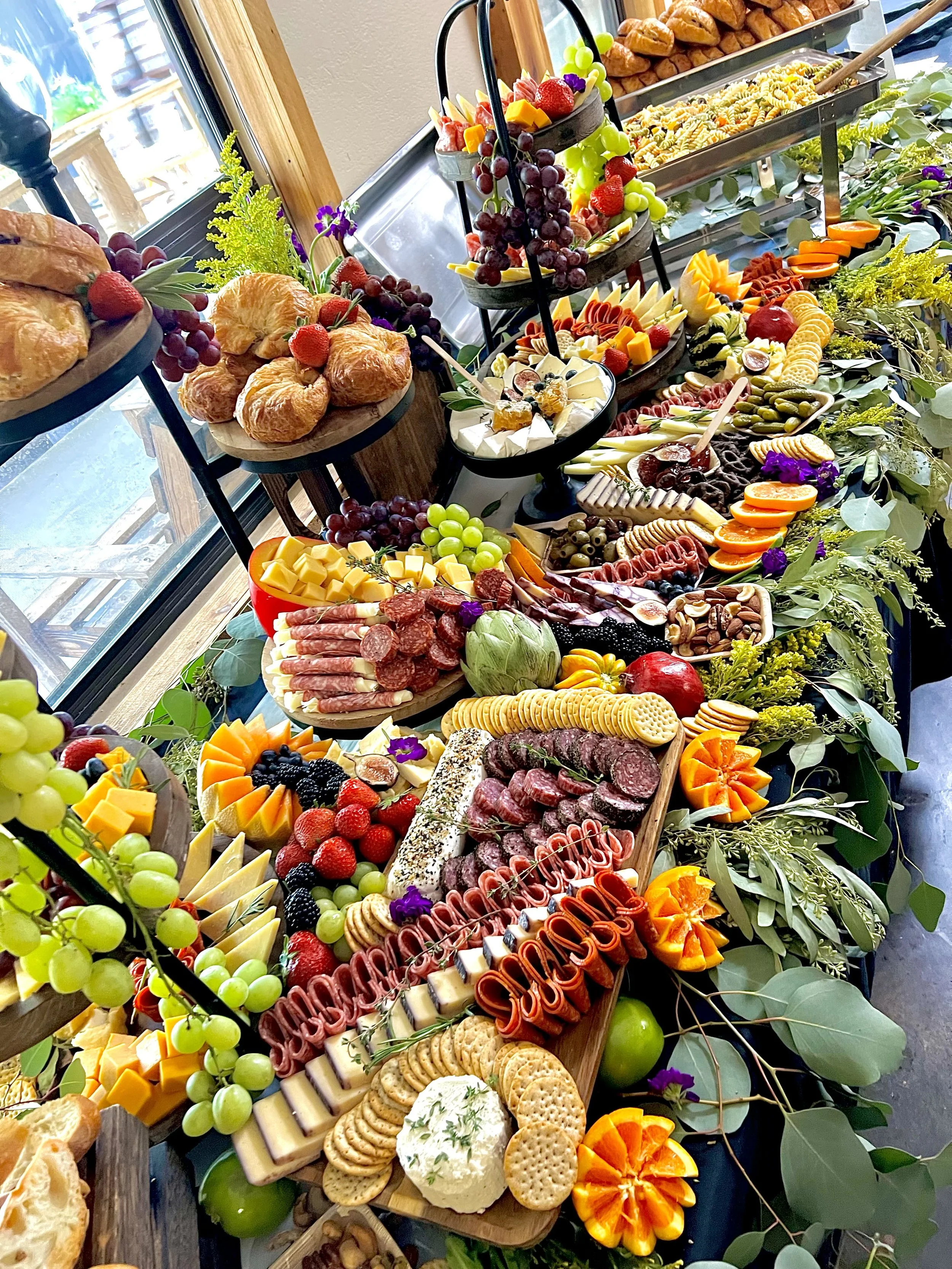Standard flat lay grazing table features include: various Artisan cheeses, fresh seasonal fruits, cured savory meats, assorted crackers, chocolates, marinated olives, pickles, jams, honey, dips and fresh herbs. Fresh greenery is always included.