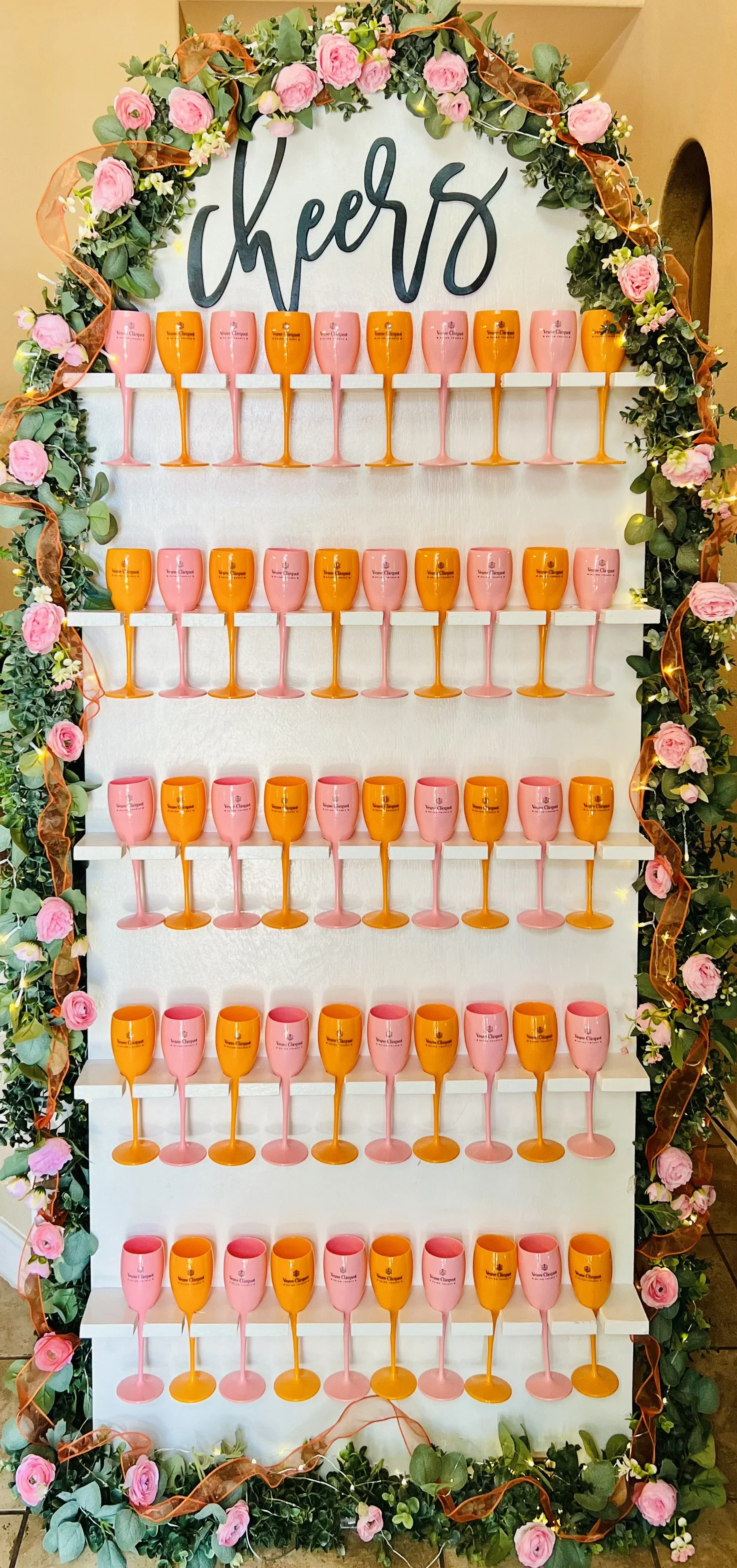 Our elegant, custom made champagne wall holds up to 50 authentic Veuve Clicquot acrylic glasses. The sleek design of the wall ensures that it will blend seamlessly with any decor, while the size ensures that it will be noticed by all who attend your event.